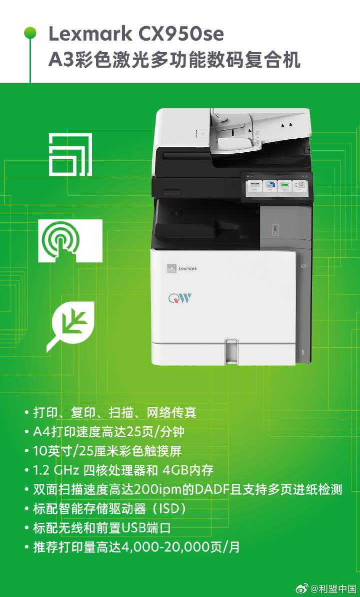 商品属性 [最大支持的介质尺寸] A3 [外型尺寸(带包装)] 1080 x 740 x 785 毫米 [重量(带包装)] 102.5 公斤 [打印速度(A4,黑色)] 高达: 25 页/每分钟 [打印速度(A4,彩色)] 高达: 25 页/每分钟 [复印速度(A4,黑色)] 高达: 25 页/每分钟 [复印速度(A4,彩色)] 高达: 25 页/每分钟 [扫描仪类型] DADF(单通道双面复印) [最大扫描区域] 297 x 432 毫米 [单面扫描速度A4] 100 页/每分钟 [双面扫描速度A4] 200 页/每分钟 [硬件扫描分辨率] 600 X 600 dpi [自动进稿器进纸容量] 200页 [显示屏尺寸及类型] 10.1 英寸(25.6 厘米)彩色触摸屏 [打印分辨率] 1200 x 1200 dpi [进纸容量(标准配置)] 500x2页进纸匣+150页多功能进纸器 [纸张输出容量(标准配置)] 500页 [支持纸张重量范围] 60 - 300 gsm [推荐的每月页容量] 4000 - 20000 页 [内存(标准)] 4G [打印机语言] PCL 5c 仿真, PCL 6 Emulation, Microsoft XPS (XML Paper Specification), Personal Printer Data Stream (PPDS), PostScript 3 Emulation, PDF 1.7 emulation, Direct Image, AirPrint™ [标准端口] 快速以太网卡10/100BaseTX (RJ-45),USB 2.0 规格高速认证(B 型),面板USB [集成双面打印] 是 [支持的介质类型] 乙烯基标签, 标签, 横幅纸, 卡片纸, 普通纸张, 聚酯标签, Dual Web Labels, 信封 [原产地] 中国 [产品保修] 一年 [替换耗材] Lexmark CX950、951、833 黑色回收计划 47700 碳粉盒 79L3HK0 47,700